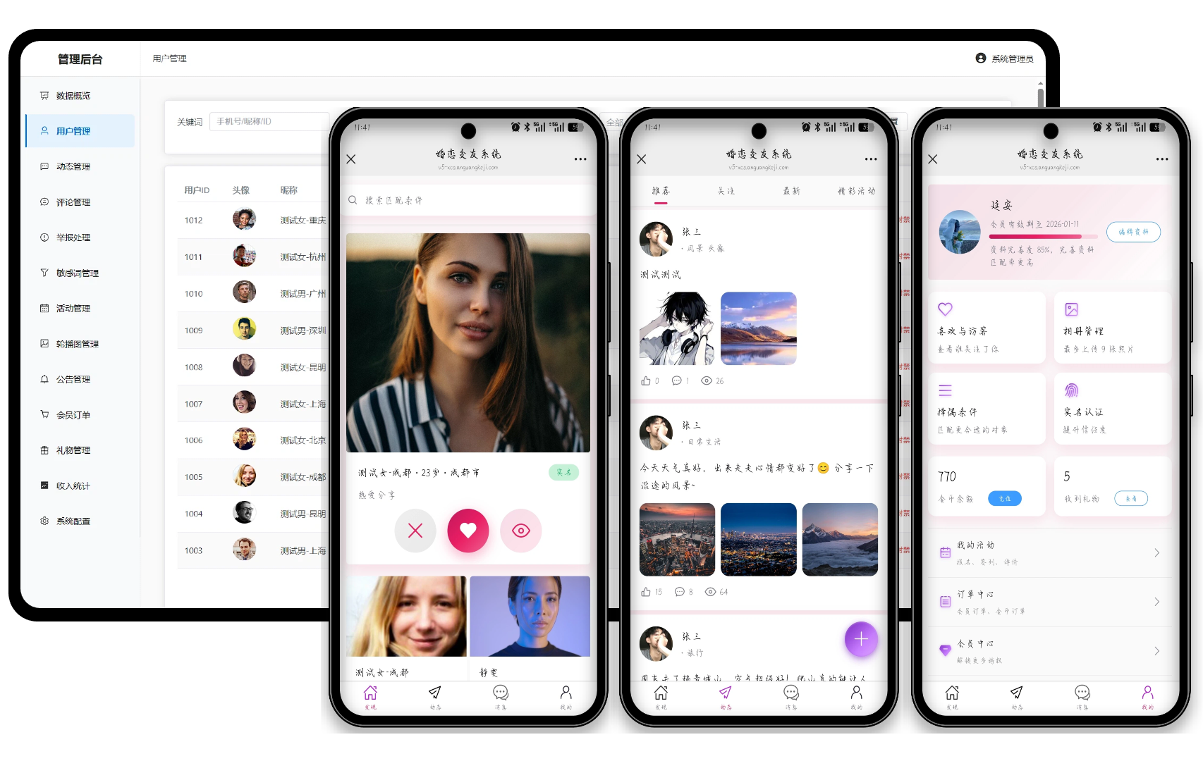 支持PC端、小程序、H5和APP多平台适配,用户可随时交友聊天红娘可便捷管理客户